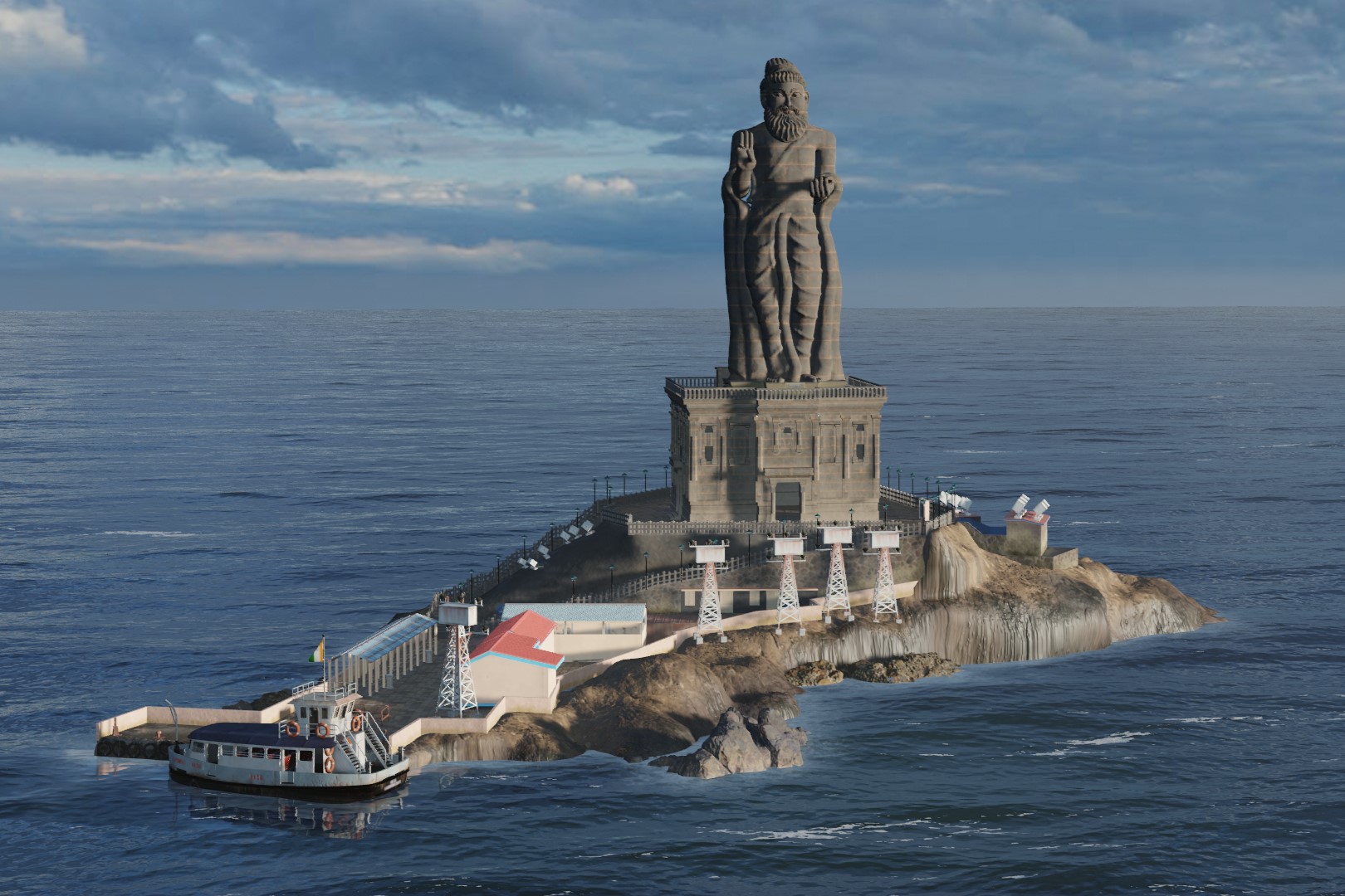 The Thiruvalluvar Statue, or the Valluvar Statue, is a 133-feet (40.6 m) tall stone sculpture of the Tamil poet and philosopher Tiruvalluvar, author of the Tirukkural, an ancient Tamil work on secular ethics and morality. It is located on a small island near the town of Kanyakumari on the southernmost point of the Indian peninsula on the Coromandel Coast, where two seas (the Bay of Bengal and the Arabian Sea) and an ocean (the Indian Ocean) meet. The statue was sculpted by the Indian sculptor Dr. V. Ganapati Sthapati.